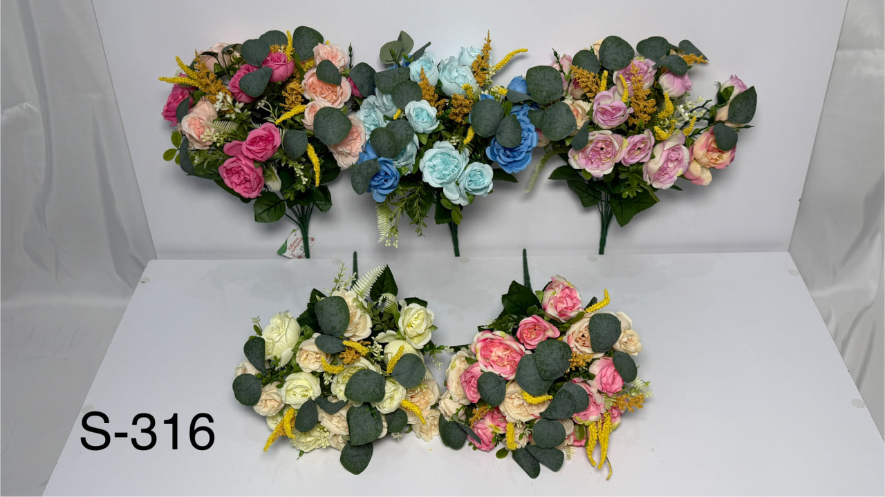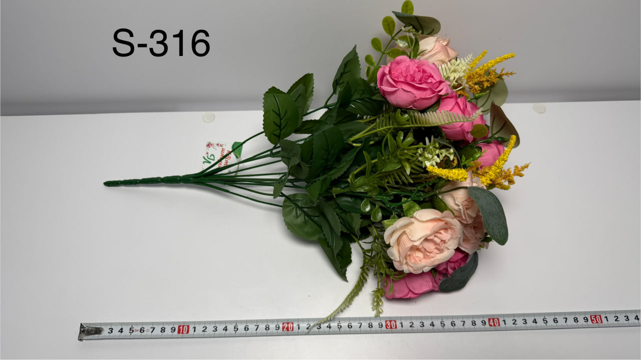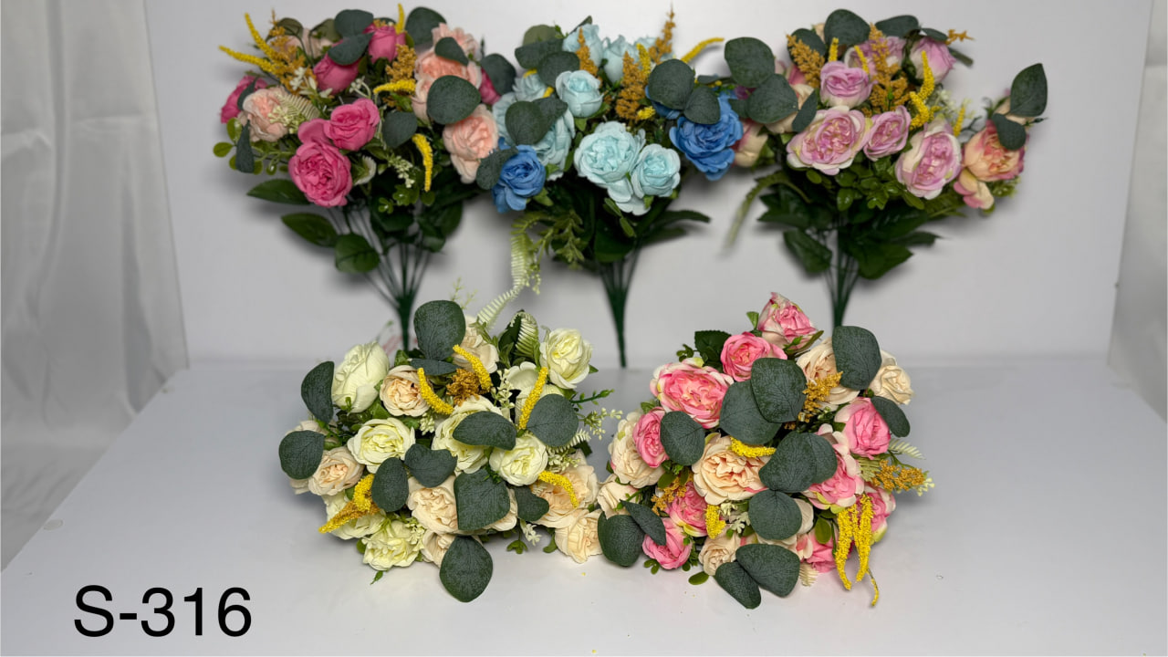 Штучний букет троянд із польовими квітами — ніжна та гармонійна композиція. Довжина букета становить 45 см. У композиції 12 гілок, завдяки чому букет має акуратний, але достатньо об’ємний вигляд. Букети представлені у 5 забарвленнях, що дозволяє підібрати варіант під різні стилістичні рішення та кольорові концепції. Товар реалізується виключно гуртовими партіями по 10 штук в одному упакуванні.