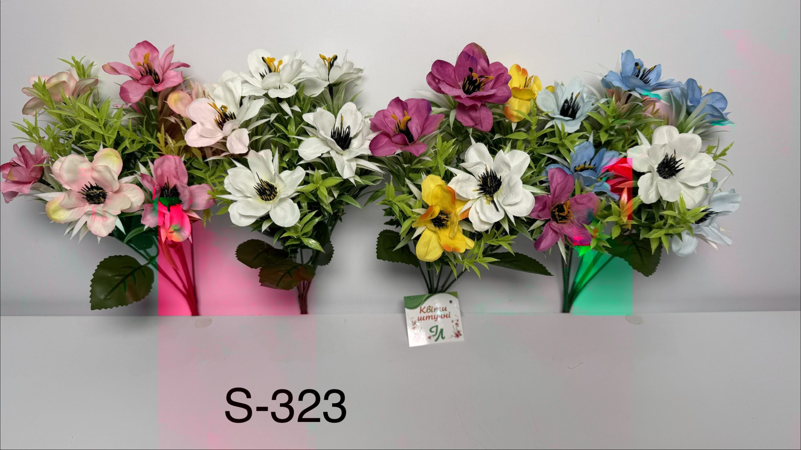 Штучний букет садових квітів — компактна та водночас виразна композиція, що передає атмосферу квітучого саду. Довжина букета становить 35 см. У букеті 7 гілок, завдяки чому він має акуратний, пропорційний і завершений вигляд. Букети представлені у 4 забарвленнях, що дозволяє підібрати оптимальний варіант для різних стилістичних рішень і кольорових поєднань. Товар реалізується виключно гуртовими партіями по 20 штук в одній коробці.